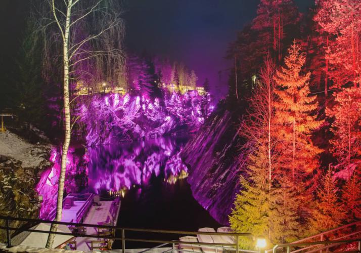 Горный парк «Рускеала» – главная круглогодичная достопримечательность Карелии. Территория горного парка огромна. Центром интереса является Мраморный каньон – большое, вытянутое с юга на север озеро с кристально чистой водой и отвесными берегами, состоящими из настоящего мрамора. Именно здесь когда-то добывали этот декоративный камень для отделки архитектурных шедевров Санкт-Петербурга. А благодаря темнеющим хвойным деревьям, снежному убранству и цветной подсветке на скалах пейзаж получается действительно сказочным!